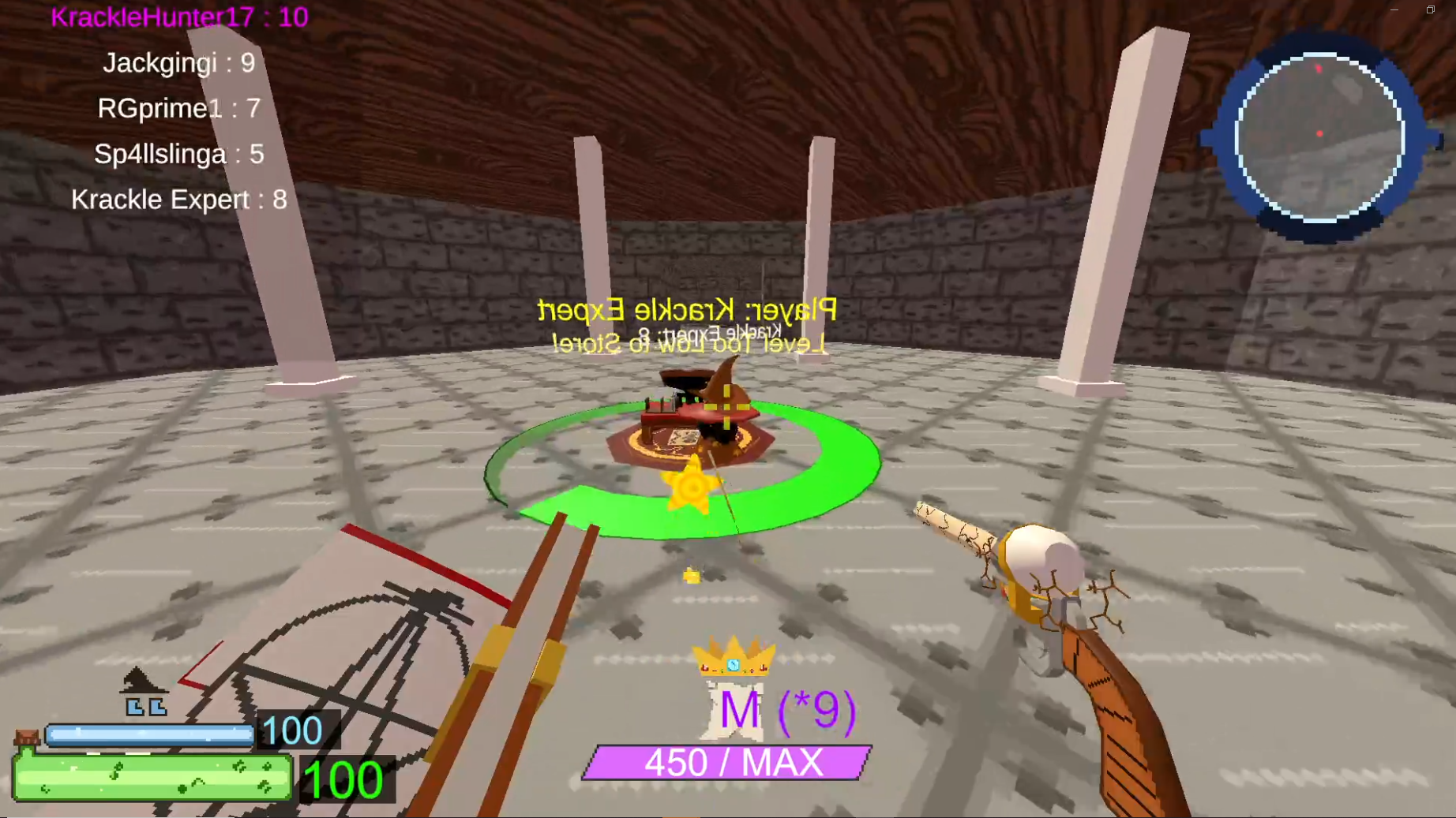 In Krackle, you will play as a gun-toting wizard hellbent on assuming their "rightful" place on the throne. For this prototype, you can play as the Spellslinger, a cowboy-themed class. Scour the map for Spellbook Pages to grow in power and then record your knowledge at the Sanctums. When you have reached the MAX LEVEL, approach the throne room and collect the Crown. Beware! Other wizards will be trying to do the same. The only way to win is by collecting the crown and using its power to be the LAST WIZARD STANDING!